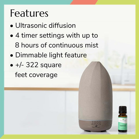 The Metro Stone Diffuser features a water reservoir (120 mL) that covers an area of approximately 322 square feet. It requires no heat or chemicals, allowing the essential oils to retain all of their natural benefits. With continuous and intermittent settings, you have complete control over how long you choose to diffuse, along with the peace of mind knowing that this diffuser will automatically shut off when the timer is complete or the water has run out. When used continuously and as directed, the Metro Stone Diffuser will give you up to eight hours of diffusion. This diffuser measures approximately 3.5" wide and 7.4" high.